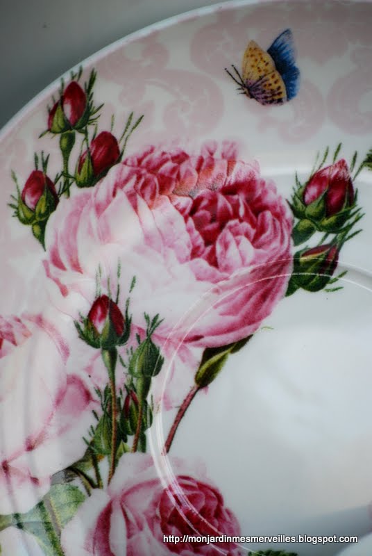 Et pour cause, quelques jours auparavant, la "grande tentatrice" Isabelle s'y était rendue aussi et en avait ramené une magnifique tasse décorée de roses qu'elle nous a montré ici. J'avoue que j'ai joué les copieuses... mais comment voulez-vous résister à une beauté pareille ? La boîte d'emballage est déjà un petit bijou à elle seule !